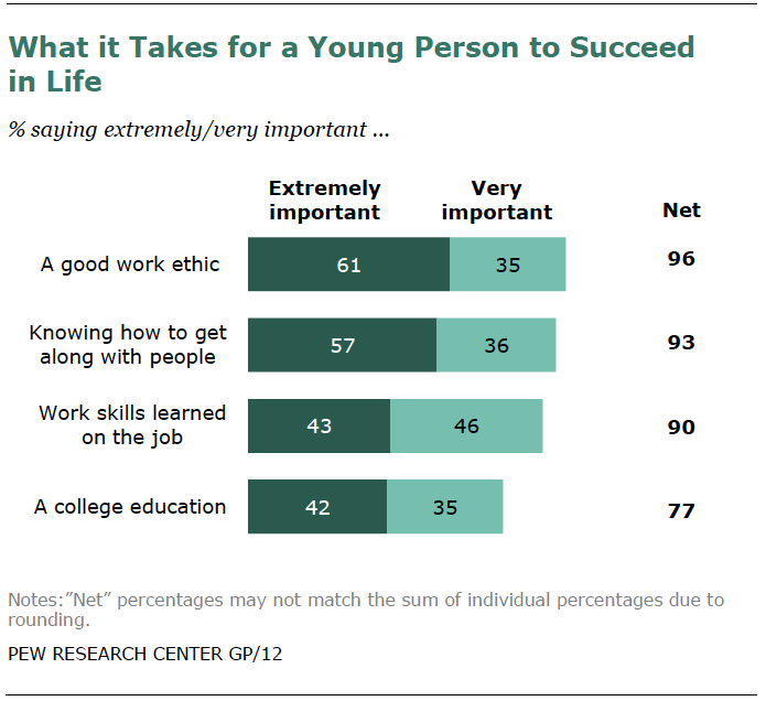 젋은 사람의 성공에 영향을 주는 요소가 무엇인가에 대한 질문에는, 1) 직업/직무 윤리(96%), 2) 인간관계에 대한 이해(93%), 직업/직무 상 직업적 기술 수준(90%), 대학교육(77%) 순으로 응답을 하였다. 그리고 대학들은 학생모집을 위해 절반정도가 교육프로그램의 강화를 꼽았다.