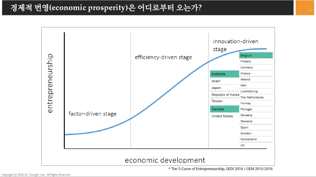 결국 세계의 흐름은 [18세기 ‘왕정시대’ ⇒ 19세기 ‘사회주의’ ⇒ 20세기 ‘자본주의’]를 거쳐 21세기 “기업가적 가치(Entrepreneurialism)”의 시대로 가치체제가 바뀌고 있음을 실증적으로 영미권 국가들이 보여주고 있는 것이다.
