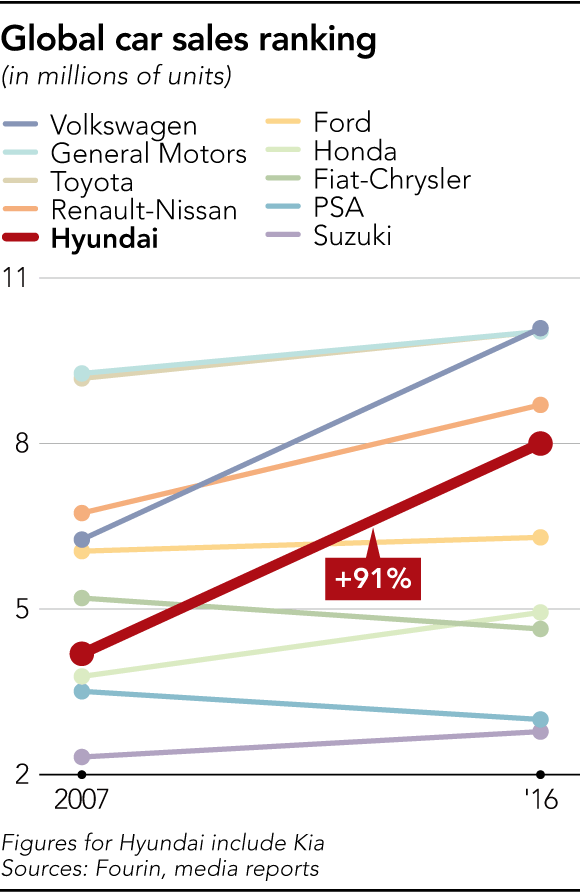 현대차는 한국 기업들의 혁신활동의 내용과 결과 그리고 미래의 흐름을 압축적으로 보여주는 한 사례라 할 수 있다. 일본의 니케이 신문에서 분석한 현대자동차의 최근 10여년의 경영활동 흐름은, 1) 시장 점유율 면에서 폭스바겐과 함께 최근 10여년간 가장 고성장을 한 기업이 현대차 이다. 2) 2012년을 기점으로 매출은 소폭 성장하는 정체 상태를 보이고 있고, 이익은 감소하여 2016년의 이익은 2010년의 수준 보다 못한 상태가 되었다.