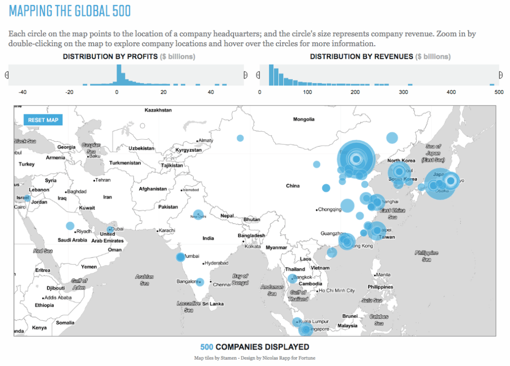 우리나라가 포함 된 아시아 및 중동지역까지 넓게 확장을 해보니, 동남아 국가 및 인도와 중동 지역에도 소수이지만 글로벌 500 기업에 속한 기업들이 자리하고 있다.