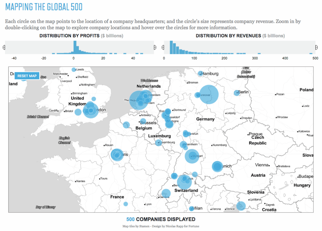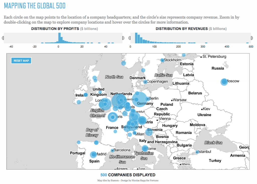 아래 그림은 “2017 포춘 글로벌 500″의 국가별 분포를 전 세계적으로 보여주는 내용이다. ‘미국-유럽-동북아3국’ 이상의 삼각축으로 구성되어 있음을 확인할 수 있다. 이들 3개의 블럭은 유사한 수준의 경제규모를 지니고 있다. 세계 경제 규모의 약 80% 가까이를 점유하고 있다. 아프리카 국가들은 단 한개의 기업도 이 명단에 이름을 올리지 못했다.