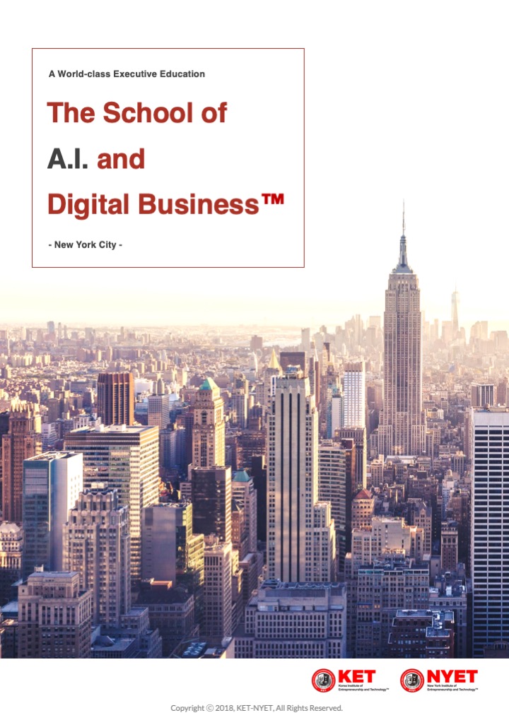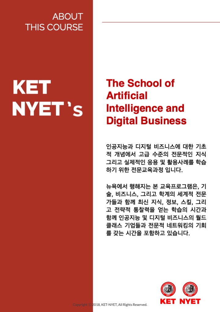 KET-NYET의 The School of Artificial Intelligence and Digital Business 는 인공지능과 디지털 비즈니스에 대한 기초적 개념에서 고급 수준의 전문적인 지식 그리고 실제적인 응용 및 활용사례를 학습하기 위한 전문교육과정 입니다.