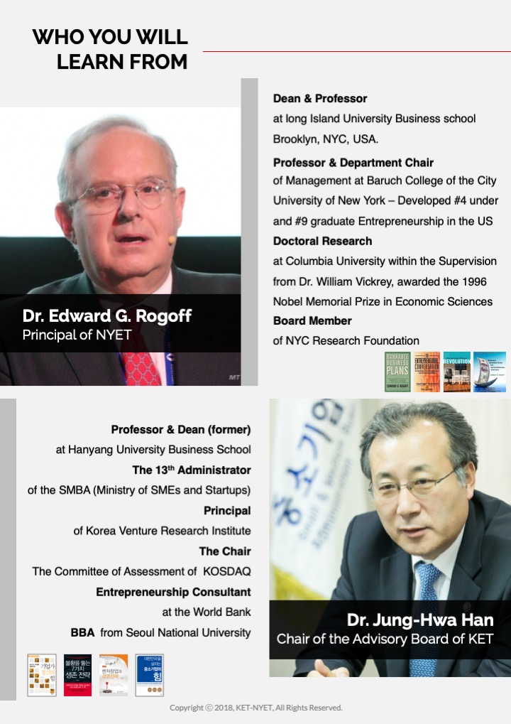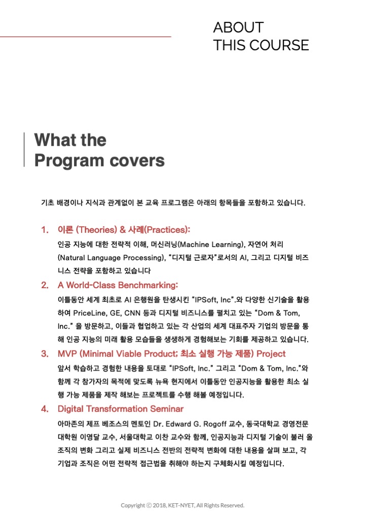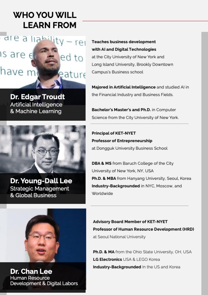 뉴욕에서 행해지는 본 교육프로그램은, 기술, 비즈니스, 그리고 학계의 세계적 전문가들과 함께 최신 지식, 정보, 스킬, 그리고 전략적 통찰력을 얻는 학습의 시간과 함께 인공지능 및 디지털 비즈니스의 월드클래스 기업들과 전문적 네트워킹의 기회를 갖는 시간을 포함하고 있습니다.