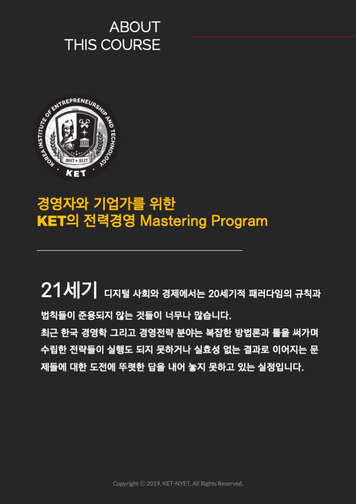 본 프로그램은 2010년대 이래 파괴된 20세기의 법칙들, 21세기에도 여전 히 계속 유효한 법칙들, 그리고 21세기 새롭게 부상한 법칙들을 함께 비교 해봄으로써 2020년대 기업들의 전략경영에 대한 인사이트를 제공하는 목적으로 준비 되었습니다. 기존의 전략경영 교과서들은 “눈에 보이는 변수”와 “눈에 보이지 않는 변수” 를 잘 구분하여 파악하고, 이를 적절히 조합하는 “운영의 묘”에 대한 부분들을 간과하고 있습니다. 경영자나 리더십들에게 이를 살필 수 있는 지혜와 통찰력이 상대적으로 서양의 경우보다 더욱 필요한 특성이 있습니다.