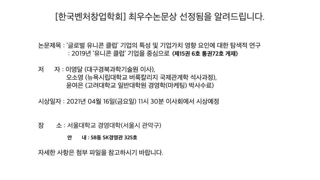 위 논문은 2021년 한국벤처창업학회 춘계학술대회에서 최우수상을 수여받기도 하였습니다.