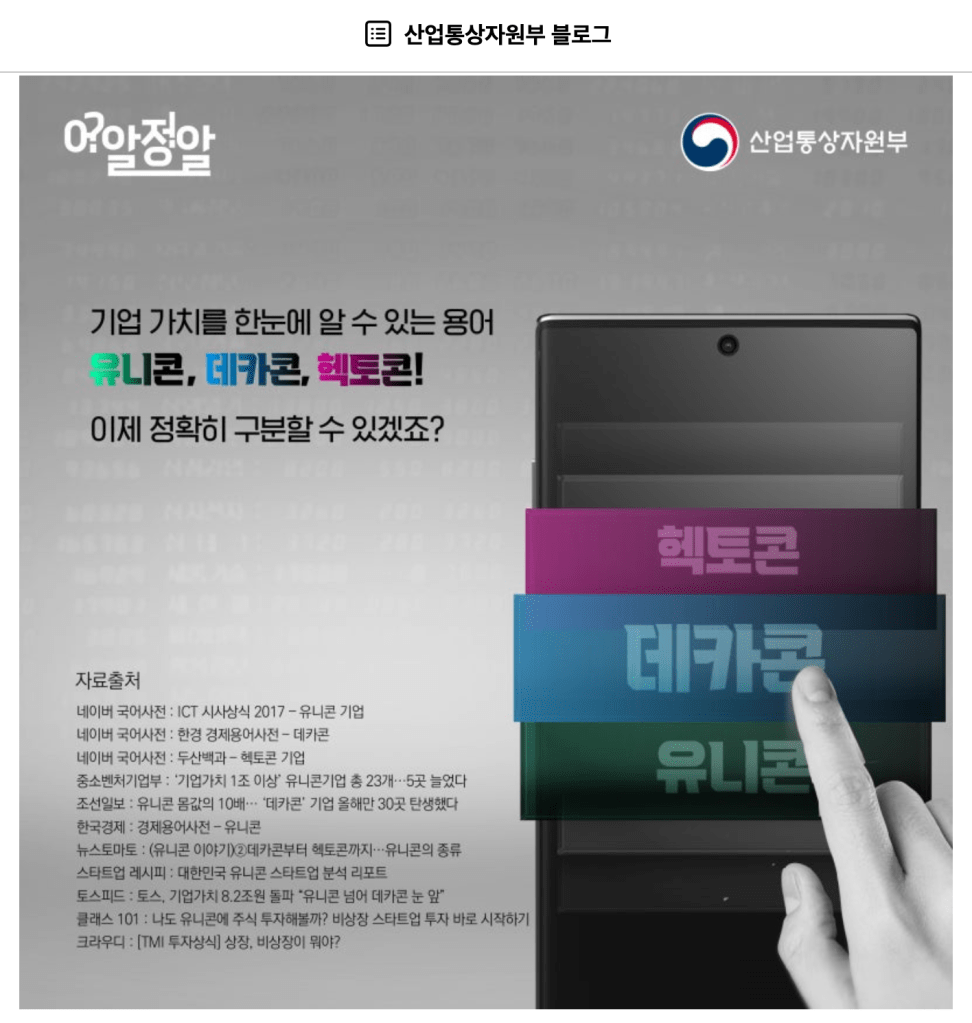 산업통상자원부 공식 블로그에 「유니콘·데카콘·헥토콘! 상상 속 동물? 아니죠~」라는 제목의 콘텐츠가 올라왔다(’22.10.21.).