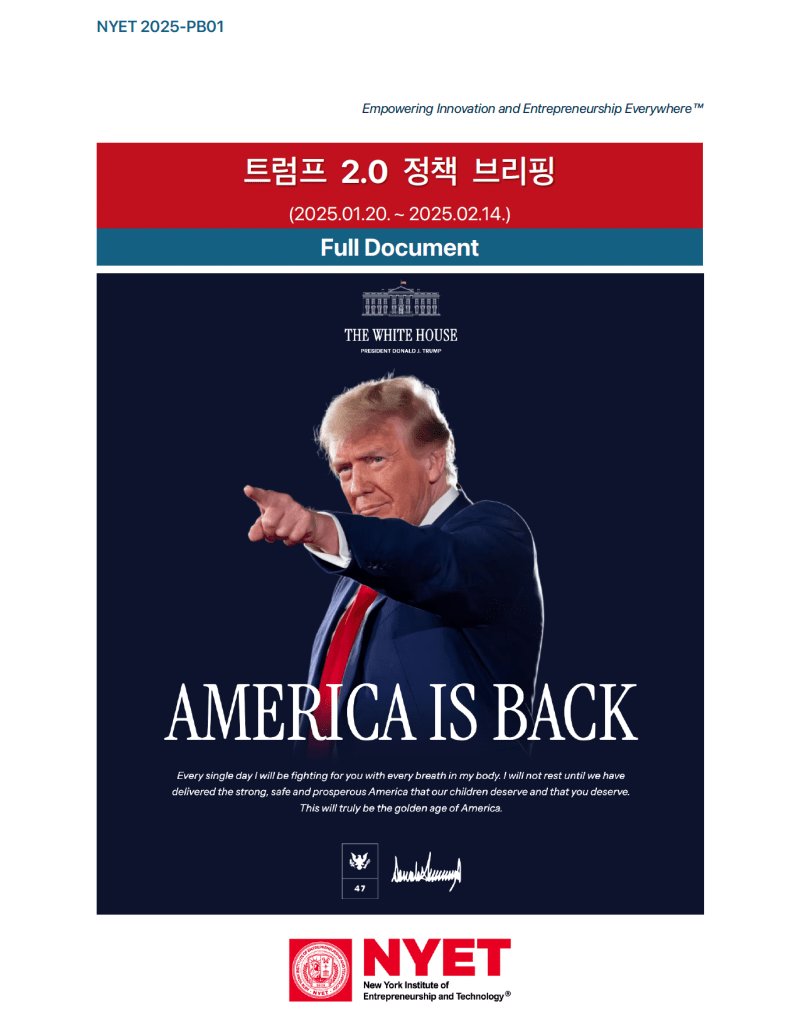 이에 따라, NYET에서는 ‘트럼프 2.0 정책 브리핑(Trump 2.0 Policy Briefing)’ 을 4주 단위로 발간하여 주요 정책 변화와 그 영향을 분석합니다.