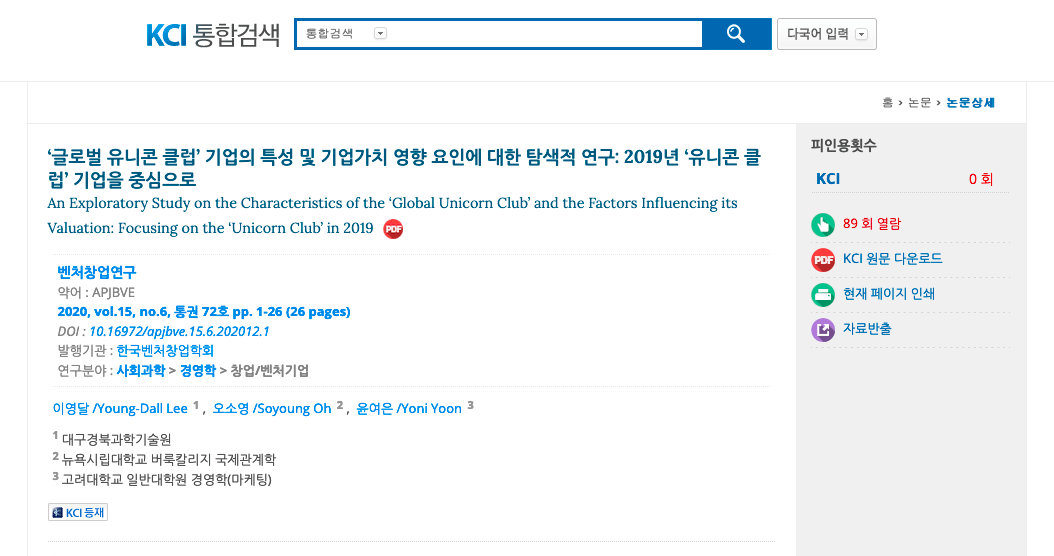 2020년 12월, 벤처창업연구 (Asia-Pacific Journal of Business Venturing and Entrepreneurship) 제 15권 6호에 이영달 원장, 오소영 연구원, 윤여은 연구원의 ‘글로벌 유니콘 클럽’ 기업의 특성 및 기업가치 영향 요인에 대한 탐색적 연구: 2019년 ‘유니콘 클럽’ 기업을 중심으로 논문이 게재되었습니다.