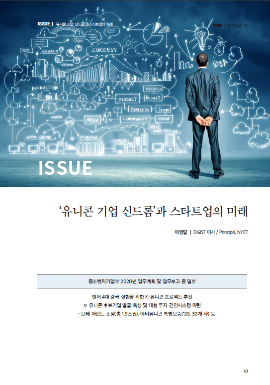 CMR 2020 Vol.22에 이영달 원장님의 ‘유니콘 기업 신드롬’과 스타트업의 미래’이 게재되었습니다. [Abstract] 2000년대 초반 만들어진 “벤처 버블”과 그 후유증으로 우리나라는 10년 이상 “벤처 빙하기”라는 시기를 보냈다. 이제는 정부가 “제 2벤처 붐”을 조성하겠다고 “K-유니콘 프로젝트”를 가동하며 “유니콘 신드롬”을 정부가 만들고 또 확산하고 있다. “제 2벤처 버블”이 만들어 질 수도 있다. 그리고 그 후유증은 이전 보다 더 […]